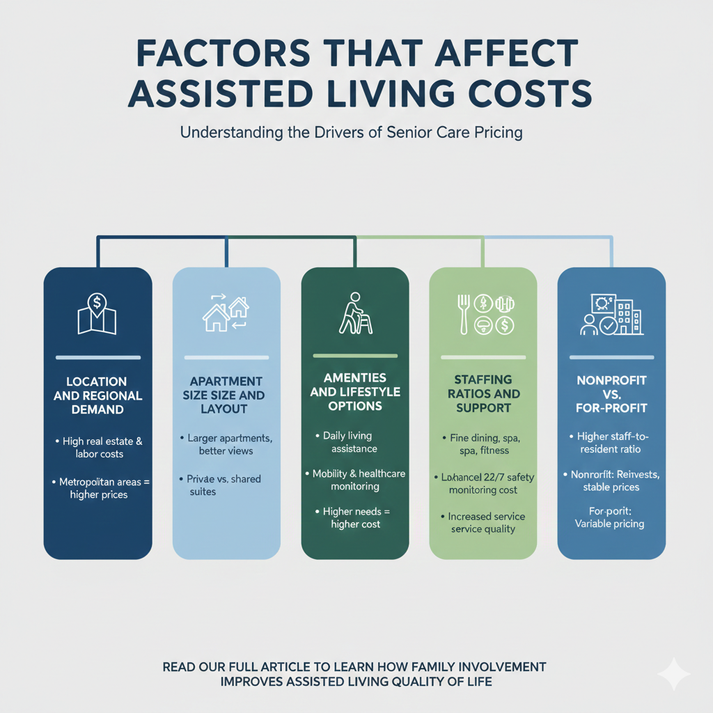 There are a number of primary factors, which have a direct impact on the assisted living overall cost and pricing variance. Learn how family involvement improves assisted living quality of life and supports daily care by reading our full article.
